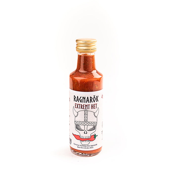 Ragnarök, ”Gudarnas skymning”, är jordens undergång i den fornnordiska mytologin och någon har beskrivit smaken av min chilisås ”som när Fenrisulven sliter sig fri från sina bojor och slukar solen”, en annan beskrev smaken ”som om Tor slår med sin hammare – inne i halsen”. Ett tredje smakomdöme löd: ”Det är som lokalbedövning – på ett bra sätt…” Smaka gärna själv, men var försiktig med doseringen – jordens undergång bör upplevas i lagoma doser…