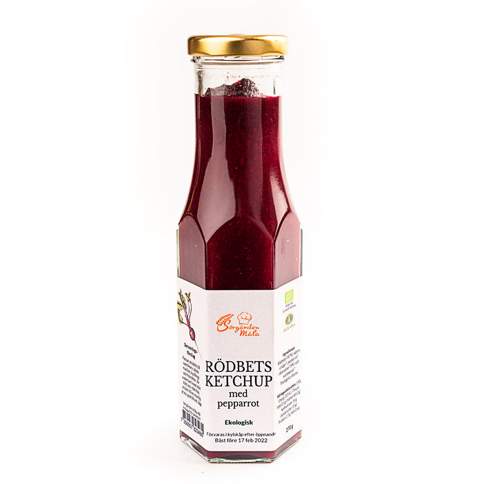 I Sverige är vi inte helt vana vid rödbetssmaken. Annat är det i Östeuropa. Där tillhör den en av favoritsmakerna. Det är min särbo, som är från Polen, som har öppnat mina smaklökar för rödbetan. Jag ville därför ta fram en god rödbetsketchup. Det är ursprungligen en judisk mattradition, men som används flitigt i hela Östeuropa. För att balansera den jordiga sötman från rödbetorna ville jag skapa lite sting i såsen. Jag bestämde mig därför att använda pepparrot. De första försöken misslyckades dock totalt. Visst gjorde rödbetorna jobbet, men jag saknade helt pepparrotens sting i såsen. Först kunde jag inte för mitt liv begripa varför. Jag hade ju ekologisk pepparrot av bästa märke direkt från min odlare och leverantör i Kungsbacka. Tillslut insåg jag i alla fall vad som var problemet: pepparroten kunde inte koka med de övriga ingredienserna – då dog den helt enkelt. När jag tillsatte den senare i processen fick jag däremot till det rätta stinget! Nu har jag en sås som jag är riktigt stolt över och vill du uppleva en verkligt unik smak då ska du välja min rödbetsketchup. Den passar utmärkt till varmkorven och skinkmackan, eller till kyckling- och fiskrätten. Ja, den passar till mycket – till rökt kött och fisk, till den mustiga grytan eller till en bit god ost.