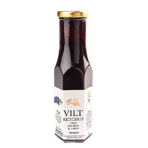 En sås behöver absolut inte vara stark för att vara mustig och smakrik. Min viltketchup, som är relativt ny i mitt sortiment, är ett lysande exempel på detta. Jag ville ta fram en sås som passade bra till smakrikt viltkött. Så jag började i vanlig ordning att ”smaka mentalt” i mitt huvud. Jag ville få fram smaker som kunde upplevas ungefär som en vandring in i urskogen – tänk dig en målning av John Bauer! Med otämjd vildhet och samtidigt lockande skönhet. Svarta vinbär och blåbär fick bli grunden, medan rönnbär och enbär blev kärnan i själva kryddningen. För att balansera och skapa en fyllig sås tillsatte jag även rårörsocker, vinäger, havssalt, svartpeppar, libbsticka, lagerblad, kanel och timjan. Och vips hade jag en smaksensation i min gryta – en trollbrygd som hämtad direkt från vildmarken!